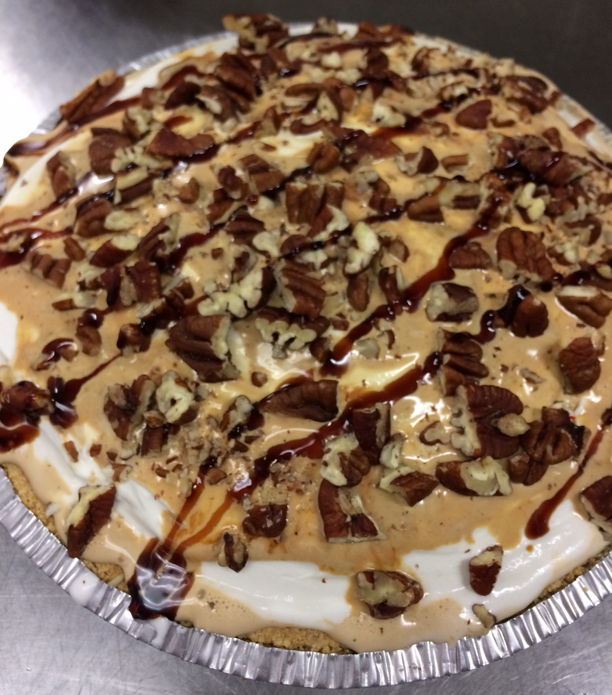 A caramel lovers delight this gelato pie has a gram cracker crust filled with salted maple caramel gelato and topped with toasted pecans and a drizzle of caramel.